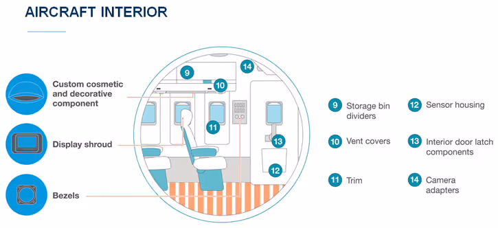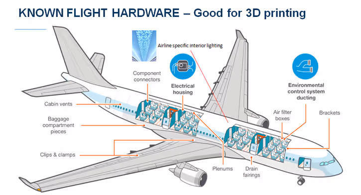 They include lightweight tooling structures to optimize manufacturing processes and directly manufactured parts for aircraft cabin interiors which have become particularly prevalent these days, with more expected in the future.