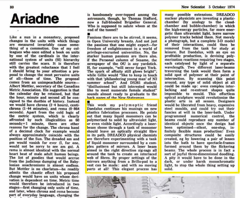 In fact, many turned out to be feasible, one of which was 3D printing. As said in the article, he raised the possibility of forming and creating 3D models by shining precise lasers onto a vat of photosensitive monomers.