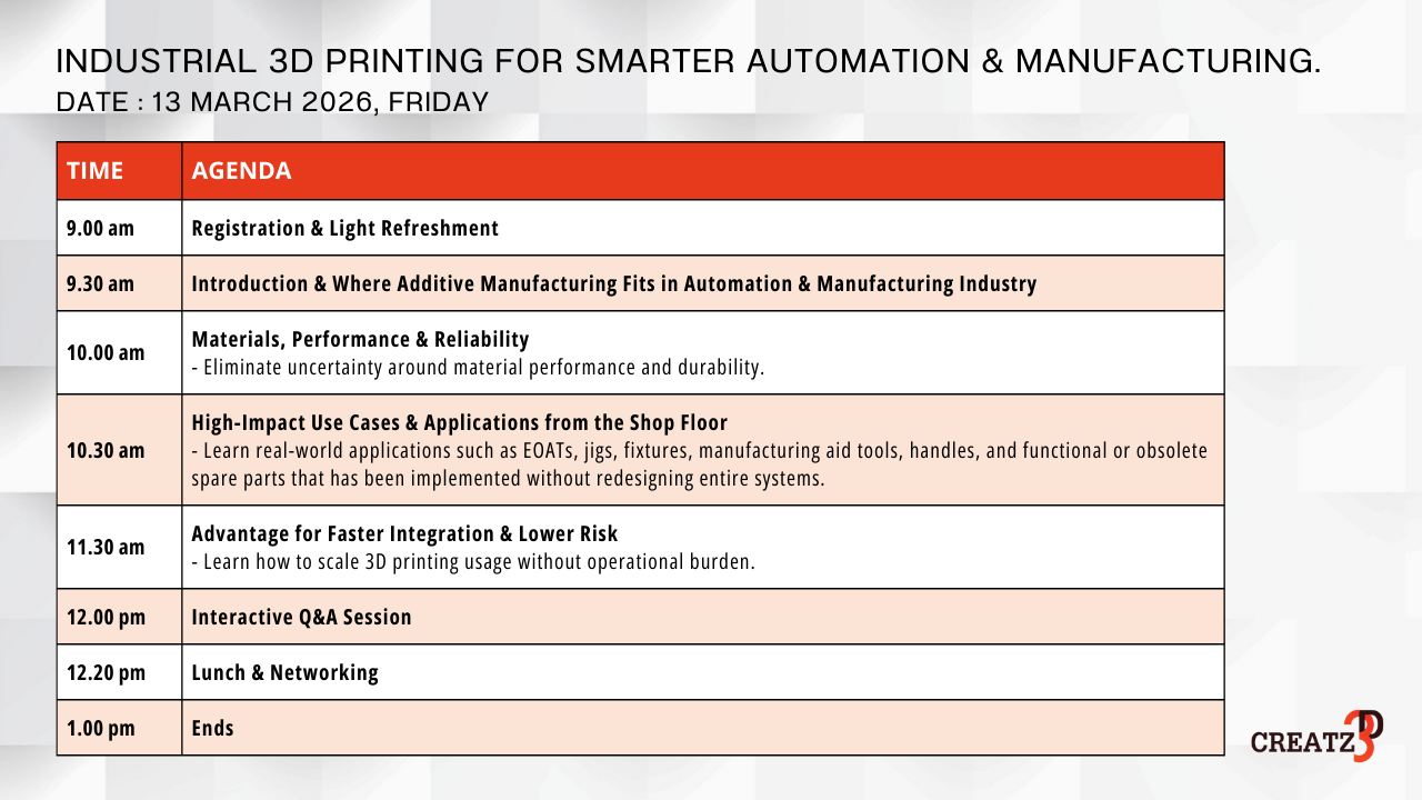 Attendees will gain clarity on what to print, when to print, and how to integrate AM as a strategic tool - either through our consultation-led or straightforward printing service bureau capabilities without capital investment.